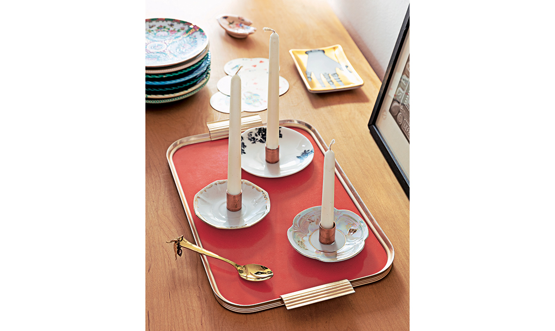 Vassoio vintage rosso corallo con profili in alluminio anodizzato [Funky Table, cm 40x28 € 130], cucchiaino da tè in ottone dorato con charms [PalermoUno, cm 9h € 35]. Svuotatasche con