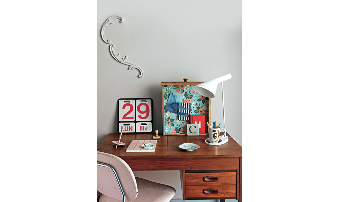 perpetuo Formosa, disegnato da Enzo Mari nel 1963 [Danese, cm 31,5x31,5h € 152]. lampada da tavolo AJ, disegnata da Arne Jacobsen nel 1957 [Louis Poulsen, cm 21,5x 35x56h € 830]. Il cassetto è rivestito con la carta da regalo [Rifle Paper Co.].