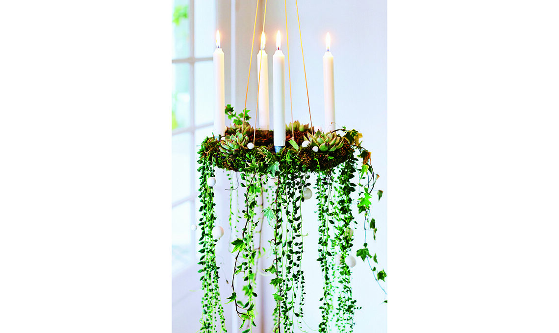- Aggiungi le candele e avvolgi su tutta la superficie il muschio fissandolo con il fil di ferro. Incorpora le talee di sempervivum e, a cascata, i lunghi rami di edera, senecio e se vuoi altre decorazioni.