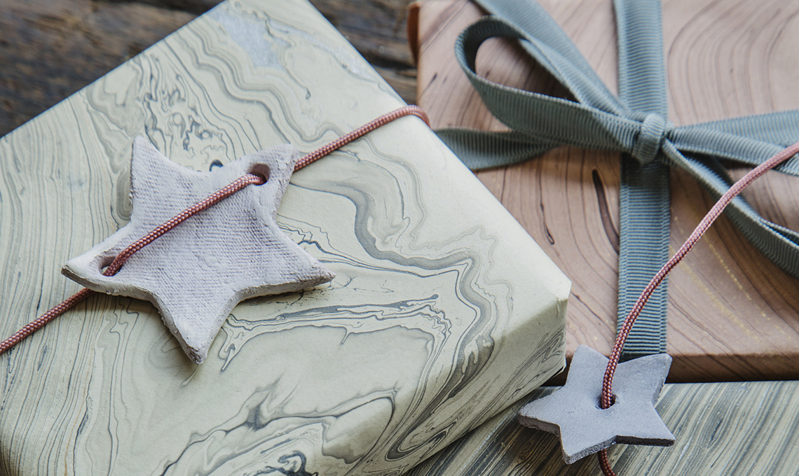 - Immergi le stelle in una ciotola con acqua con il colore per il tessuto, lasciale scolare e asciugare completamente. Infila le stelle nel cordoncino e utilizzale come chiudipacco o per creare un festone decorativo per l’albero o per la tavola di Natale.