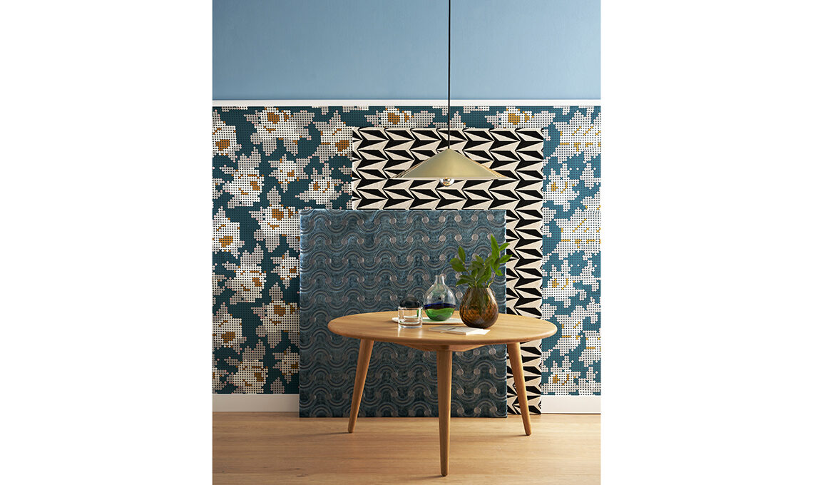 Coffee table CH008 in rovere, lampada Pendant Lamp BT1001 in ottone, vasi Macramé e Murano Singleflower [Carl Hansen & Son]. vaso Ecrin [Nude]. tessuti Origami Rockets Monochrome, Peg Art Roses Teal e Spot on waves Teal [Kirkby Design - The Romo Group].