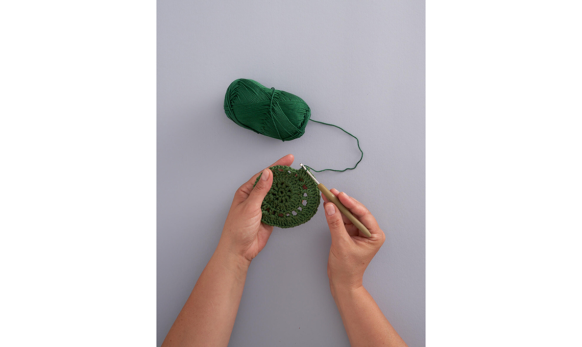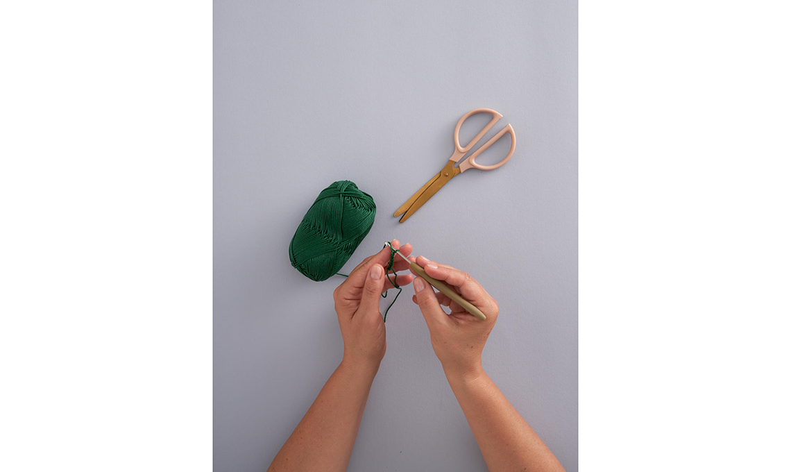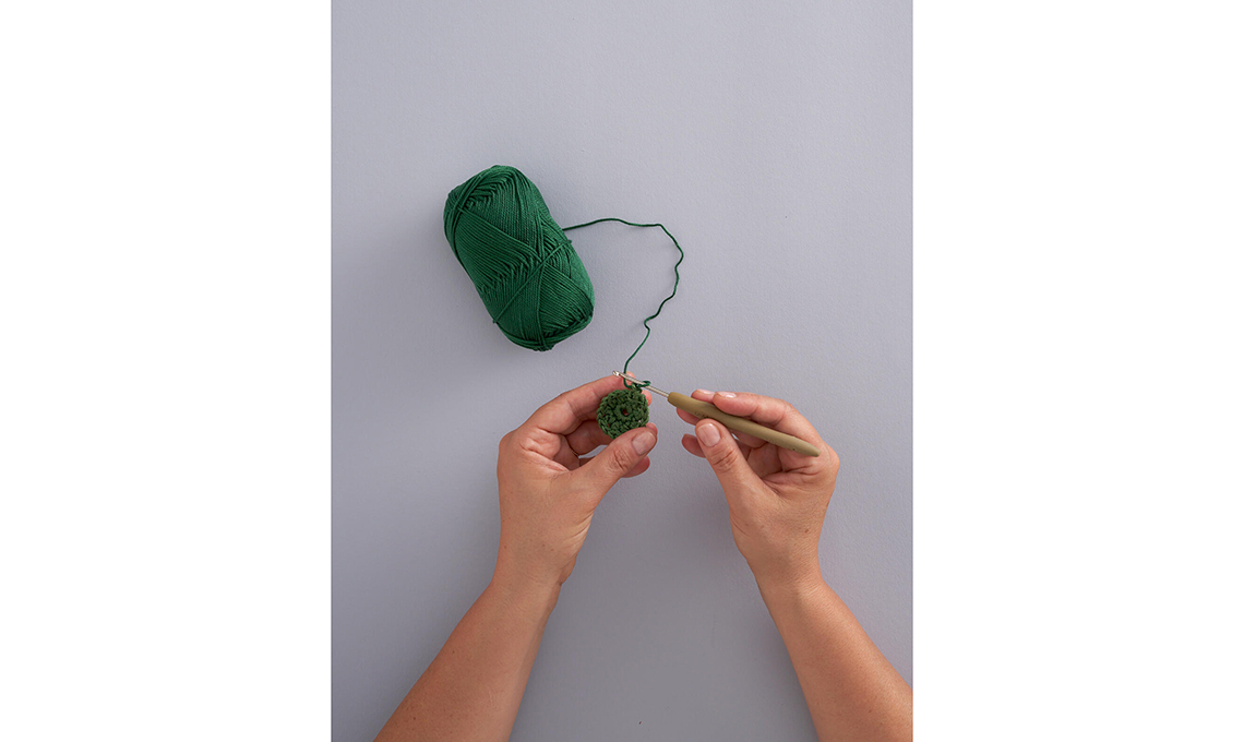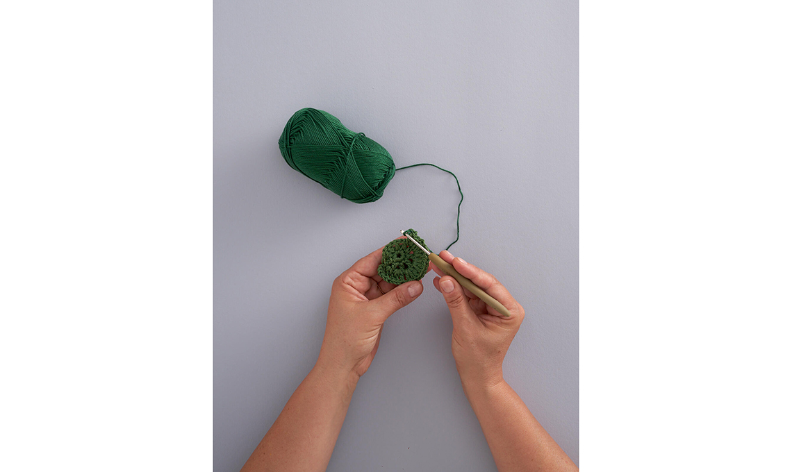 1. Avvio: con il cotone verde e l’uncinetto lav. 10 m.b e chiudi a cerchio.