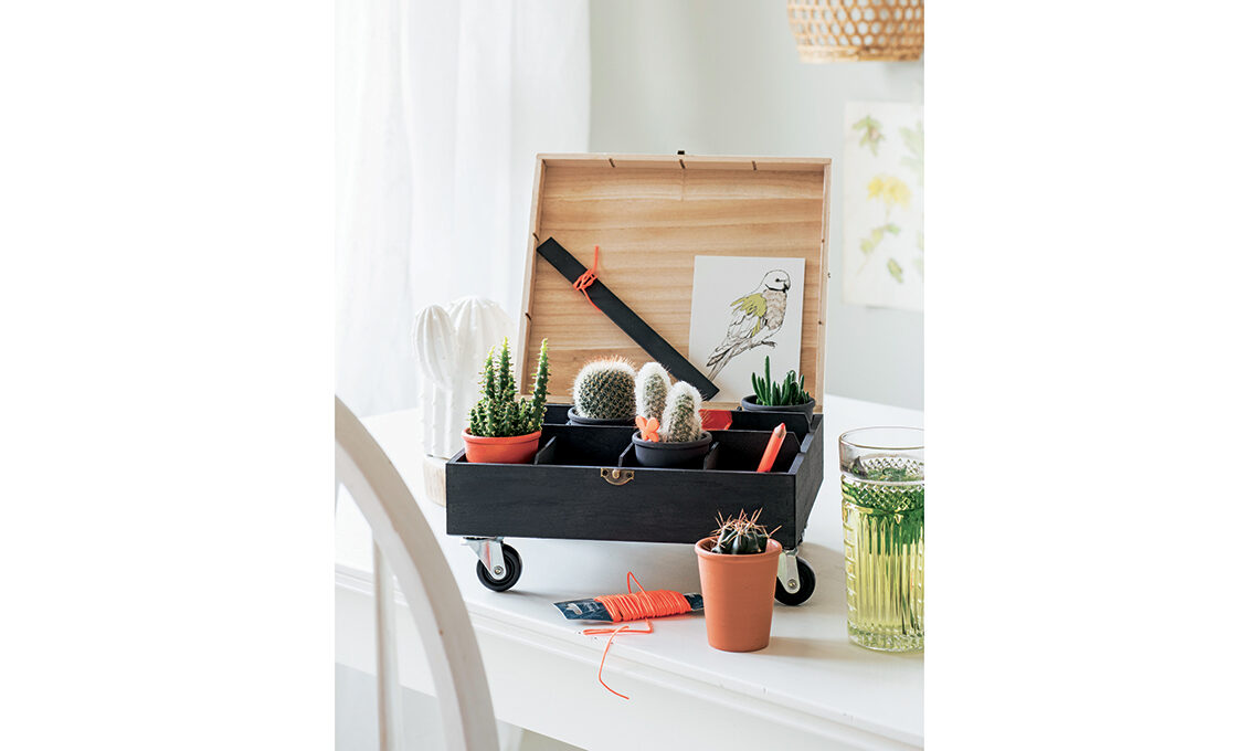 Versione su ruote per la scatola di legno che diventa scrigno green per esporre le piantine. Dipingi base e interno della scatola di nero + un tocco fluo e incolla sul fondo le ruote.