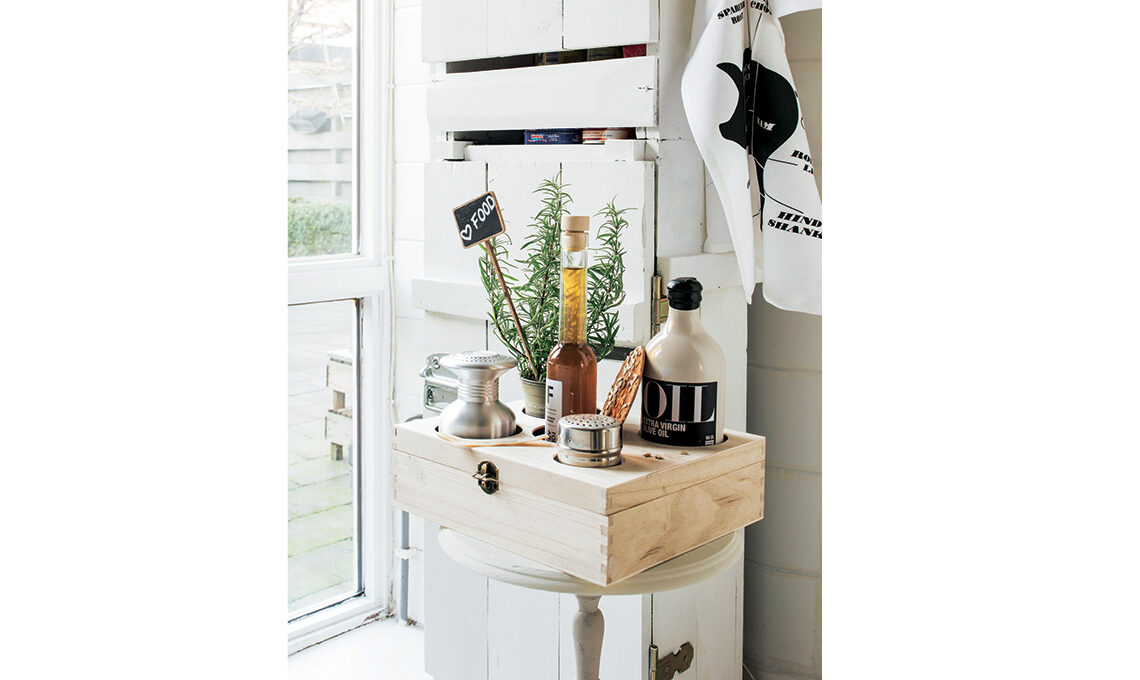 Legno al naturale per la scatola che inventa una soluzione storage per avere sempre sottomano (e non rovesciare) le spezie, la bottiglia dell’olio, l’aceto e le aromatiche. Svita il coperchio della scatola di legno, disegna dei cerchi in misura di quello che vuoi posizionare e, con il trapano con le punte a tazza di diversi diametri, realizza i fori. Riavvita il coperchio e la scatola storage è pronta.