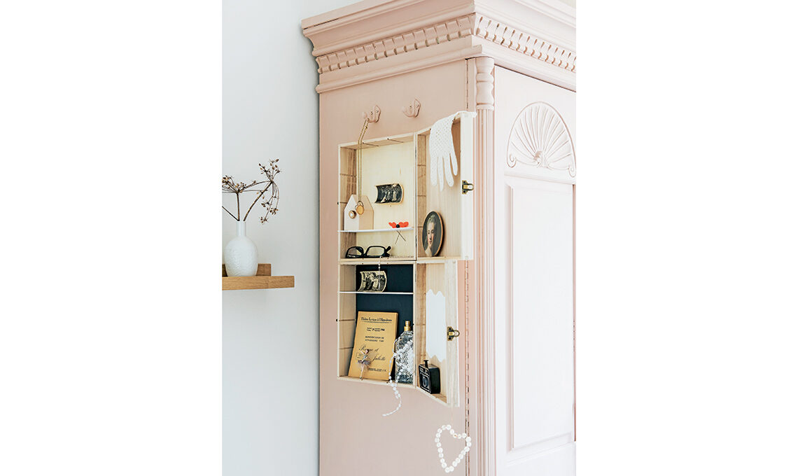 La box è realizzata con due scatole di legno incollate in verticale, in modo che i coperchi formino una doppia antina laterale. Dipingi a piacere l’interno delle scatole o decorali con ritagli di wallpaper o con i nastri washi tape. Sposta a seconda delle necessità i divisori interni, per creare le mensoline display. Ti basterà chiudere le antine e i cimeli e i ricordi più cari saranno al sicuro.