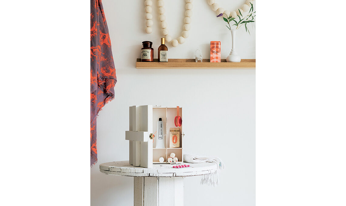 Rivisitazione raw e 100% fai-da-te per la classica scatola porta medicine. La base di partenza? È sempre lei, la scatoletta di legno per le bustine da tè, dipinta dentro e fuori (divisori compresi) in total white e utilizzata in verticale, da appoggiare o appendere come se fosse un piccolo pensile. Iconica la croce realizzata con due listelli di legno dipinti e incollati sull’antina.