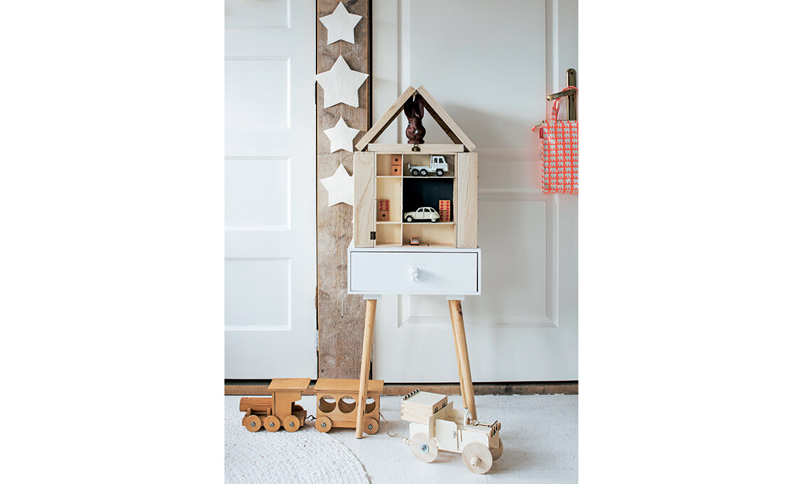 Mini shopper di tela fluo [Engelpunt], festone con stelle di carta [Atelier Sukha], mobiletto con cassetto e gambe in legno [Action], pomello in legno [Loods 5].