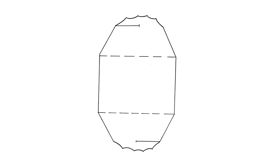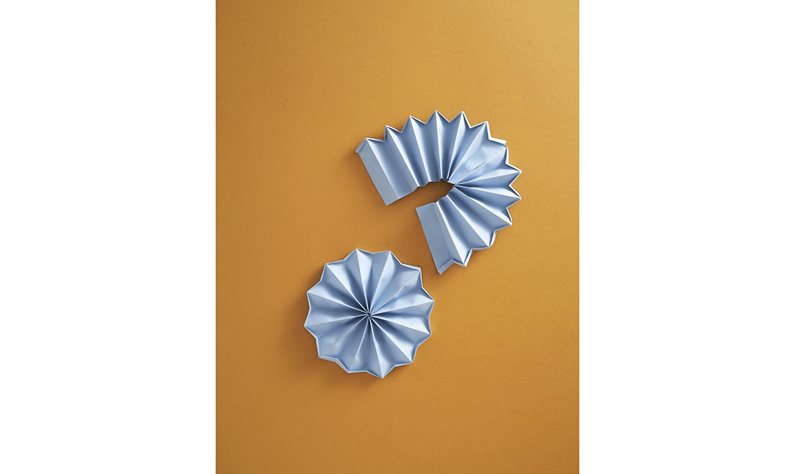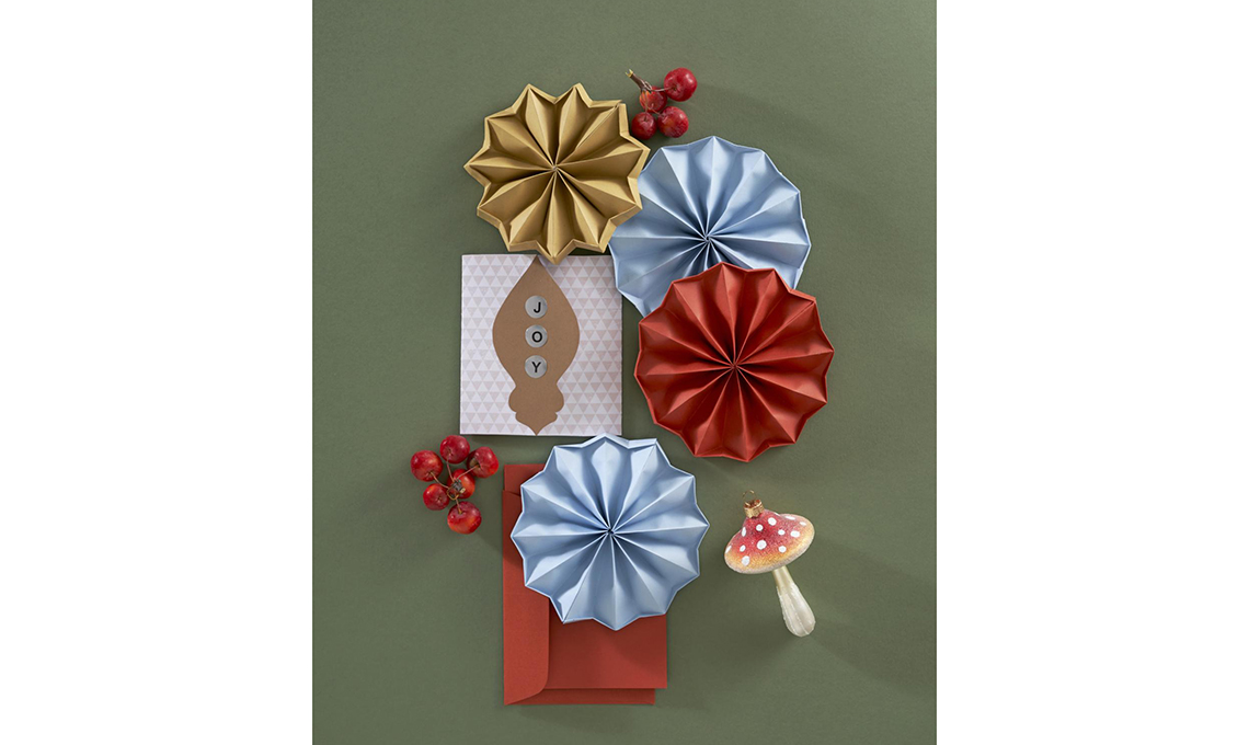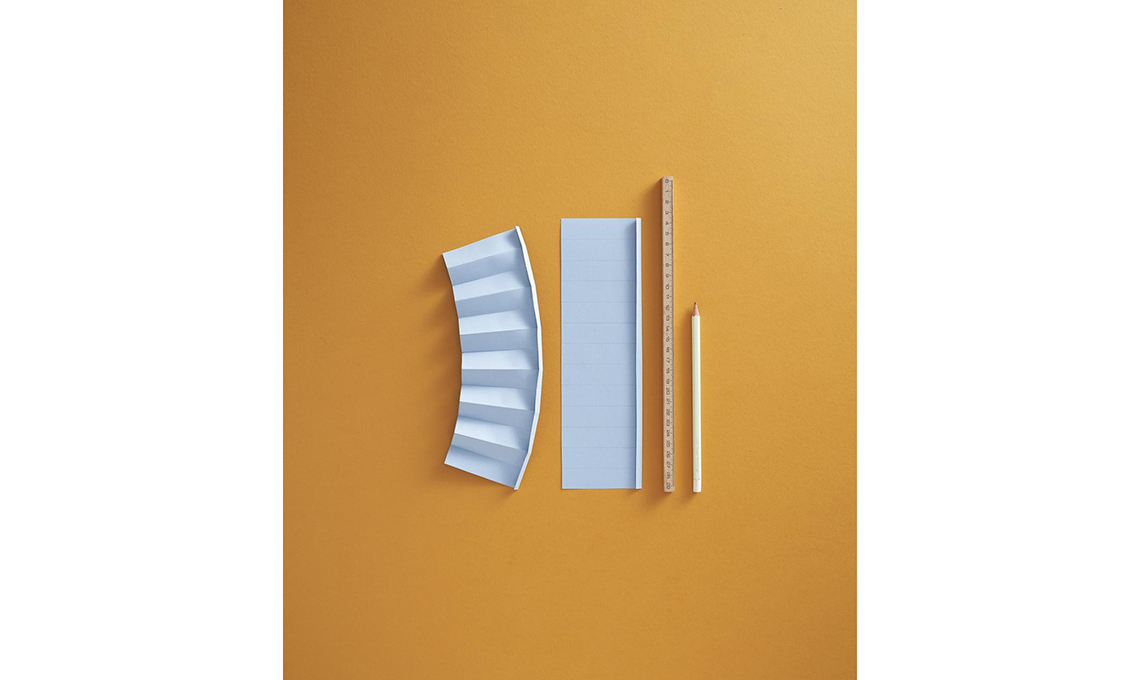 Riporta il template sul foglio di carta colorata. Ritaglia lungo la linea centrale, per avere 2 rettangoli di cm 26x9. Seguendo le linee tracciate realizza una piegatura a fisarmonica. Fai su un lato lungo una doppia piega di mm 5, in modo da creare un profilo. Gira il foglio e schiaccia dall’interno le pieghe. Piega entrambi i rettangoli e incollali formando una stella.
