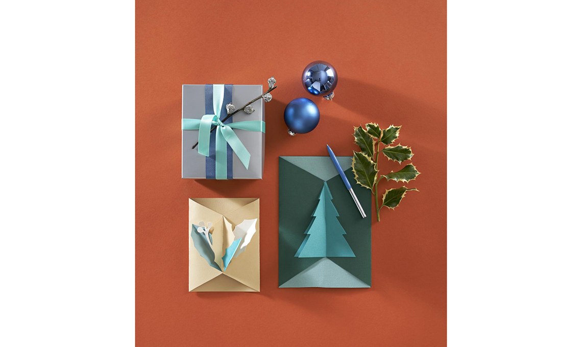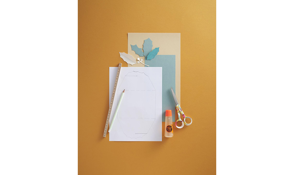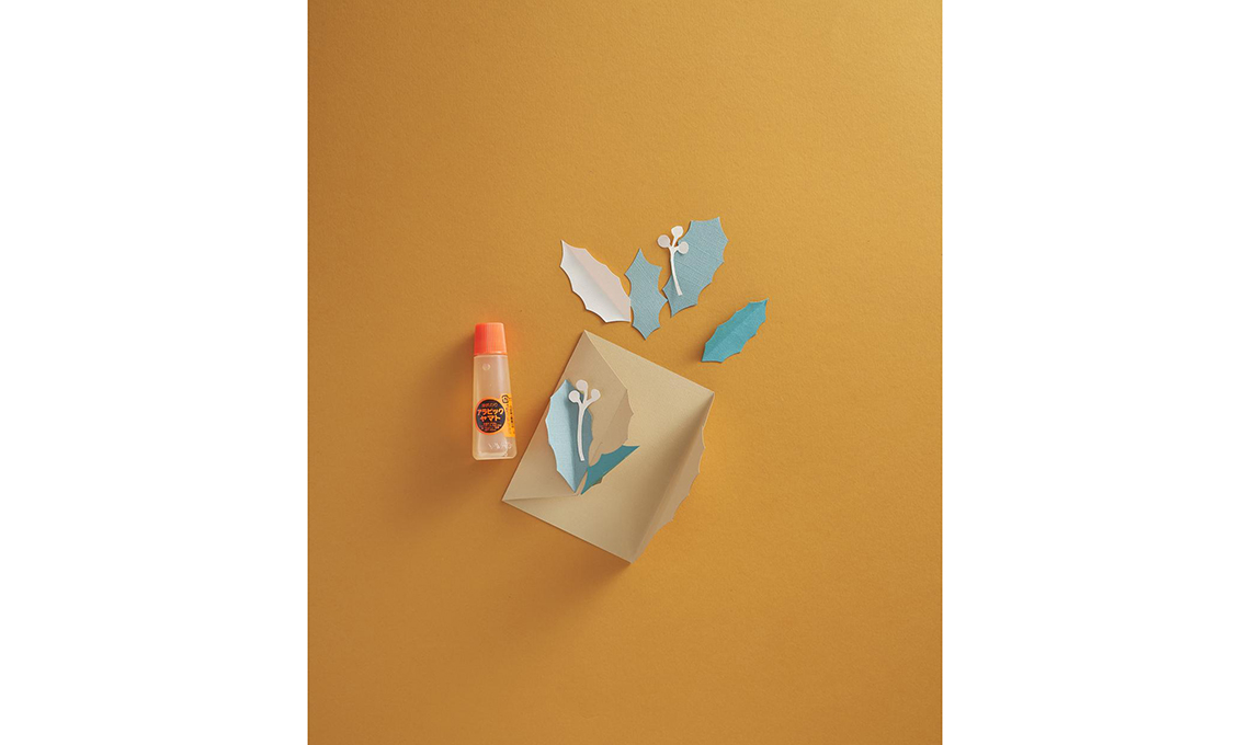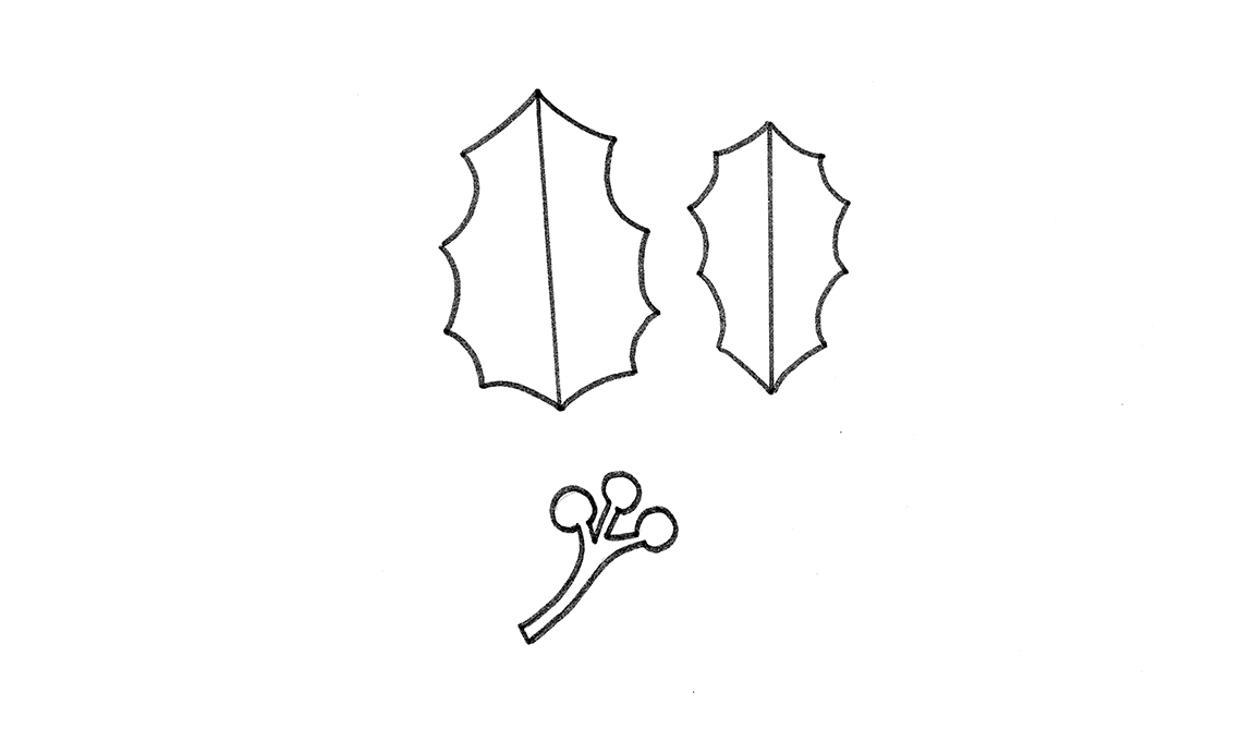 Su un foglio di carta ingrandisci a piacere i template per realizzare il biglietto e ritagliali. Utilizza le dime per ritagliare dai cartoncini colorati tutte le sagome. Ripiega il biglietto seguendo le linee tratteggiate e incidi i tagli ai lati. Chiudi il biglietto incastrando le alette nei tagli, quindi incolla le foglie e le bacche dell’agrifoglio.