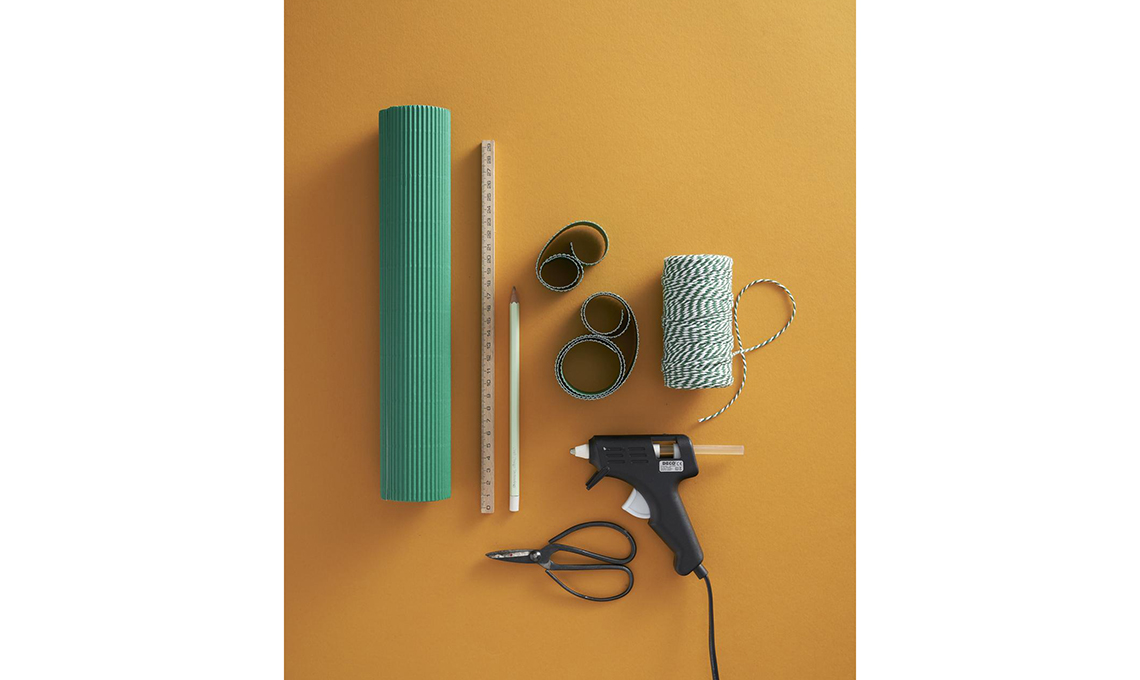 Ritaglia dal cartoncino ondulato 5 strisce lunghe cm 20 e di diverse altezze (da 1 a 5 cm). Ripiega a metà un pezzo di cordoncino di cm 15 e incollalo al centro della striscia più alta. 3 Arrotola la striscia e fermala con la colla. Sovrapponi, arrotola e incolla le altre strisce, dalla più grande alla più piccola, creando un effetto 3D.