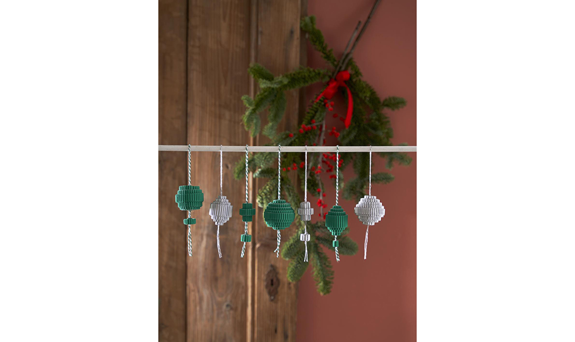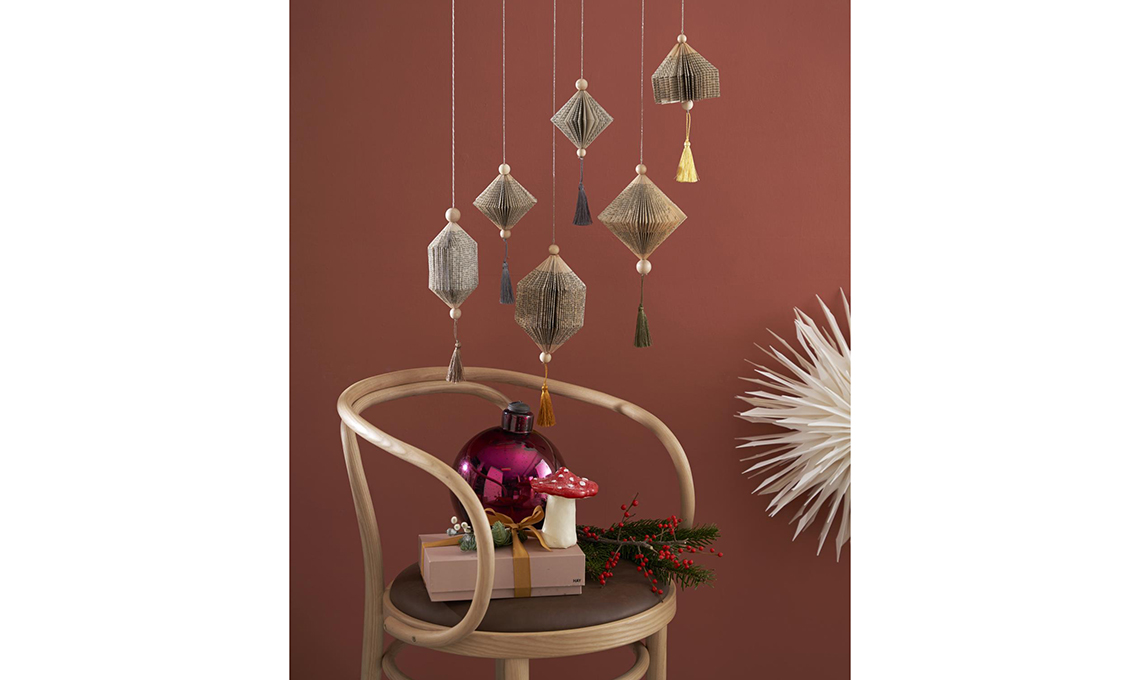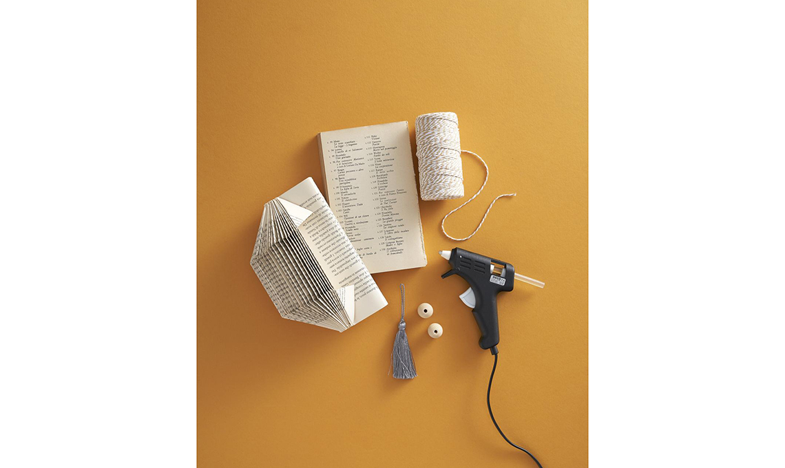 Dopo aver tolto la copertina dei vecchi libri (li trovi nelle riciclerie o isole ecologiche della tua città), piega la prima pagina a metà, in lunghezza. Ripiega i lati corti verso la costa del libro, ottenendo due triangoli. Allo stesso modo piega tutte le pagine. Inserisci tra le pagine il cordoncino decorato con le perle di legno e la nappina, quindi incolla le pagine per chiudere l’addobbo.