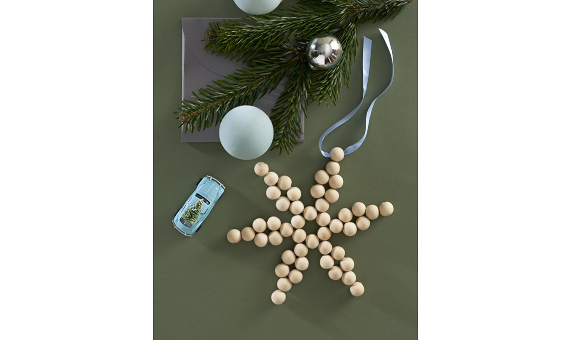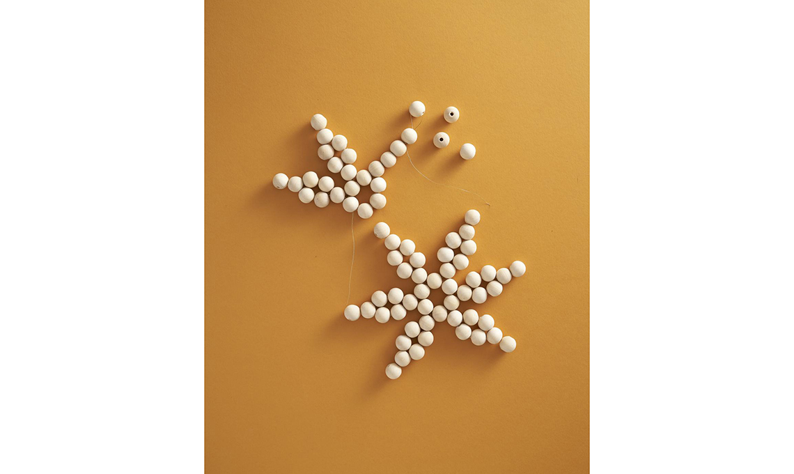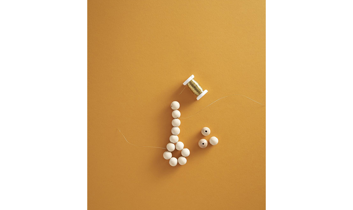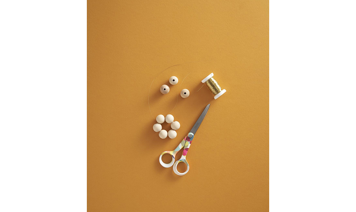Infila sul filo ottonato 6 perle di legno e chiudi a cerchio. Su un capo infila 5 perle, esci con il filo nella penultima e infila 2 perle. Fai passare il filo nell’ultima perla e in quella accanto. Hai realizzato la prima punta della stella. Allo stesso modo crea le altre cinque punte.