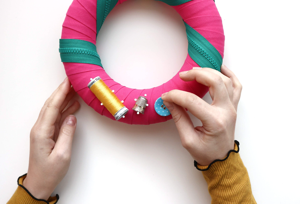 - Terminata la copertura realizza un pendente in tinta, ad esempio decorando un fondo dei pirottini con la passamaneria. Io ho cucito una piuma su un pezzetto di nastro, legandolo poi con un filo all’anello di polistirolo. Se stai realizzando la ghirlanda per un’occasione particolare puoi realizzare il pendente in tema: un cuore per San Valentino, una stella per Natale, l’iniziale del nome per un fiocco nascita.