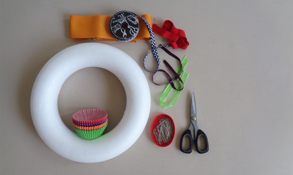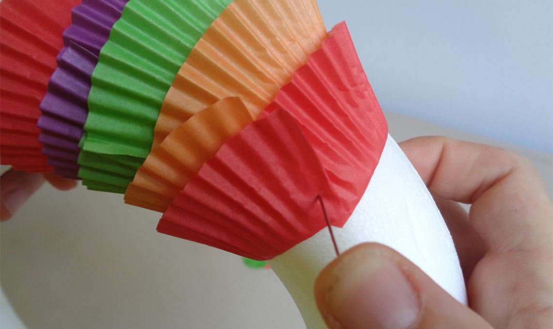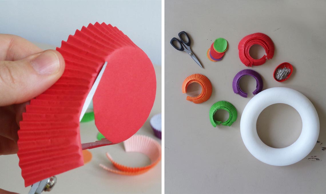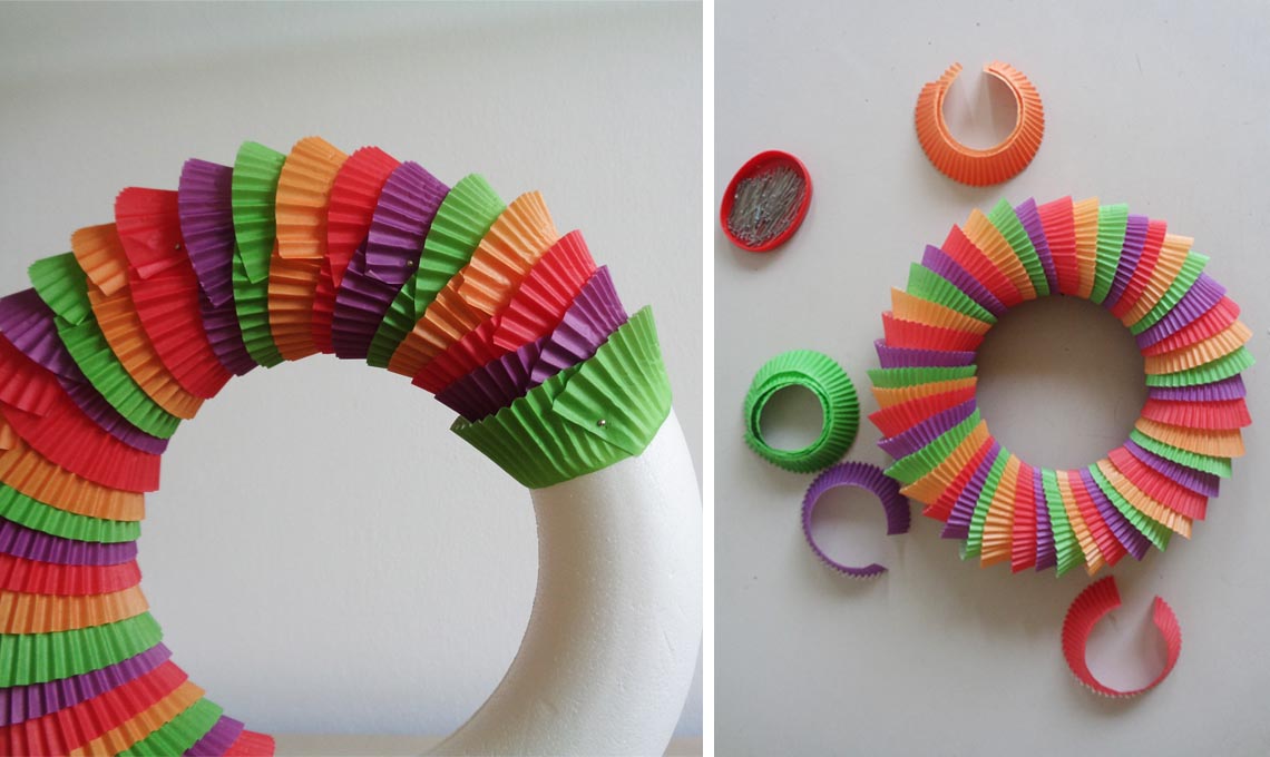 - Ora avvolgi la corona di polistirolo con un pirottino aperto, fissandolo sul retro con uno spillo. Continua a ricoprire la ghirlanda in questo modo, sovrapponendo leggermente i pirottini.