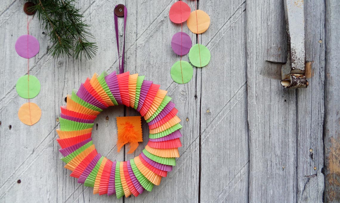 - Crea, sempre con un nastro e uno spillo, un’asola per appendere la ghirlanda. I fondi dei pirottini puoi anche cucirli in linea formando dei festoni decorativi. Saranno perfettamente in tinta e potranno arricchire l’ambientazione della ghirlanda, ad esempio sulla porta d’ingresso.