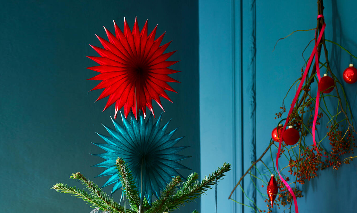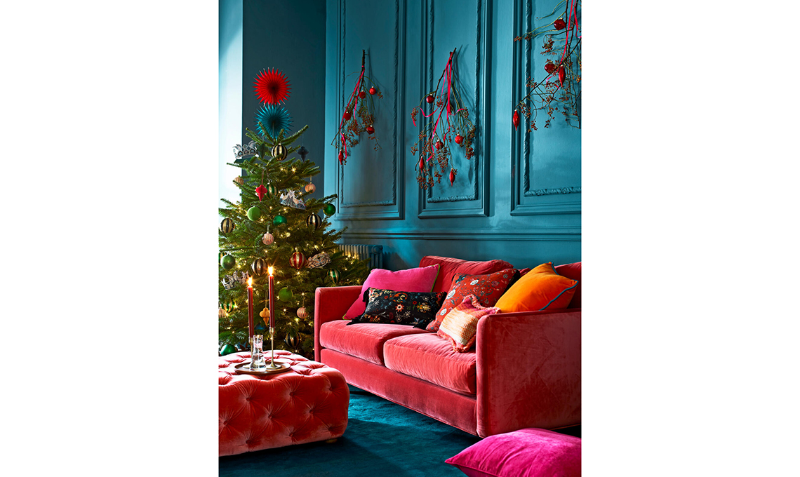 I dettagli fanno la differenza! Come le coroncine gioiello di lamierino abbinate alle classiche boules, ai decori paper made e al puntale fuori dagli schemi. Al posto del classico angelo, due stelle di carta sovrapposte troneggiano sulla punta dell’albero. Qui in ciliegia e ottanio come la parete con la boiserie decorata con rami, tante micro palline ed eleganti nastri di velluto.