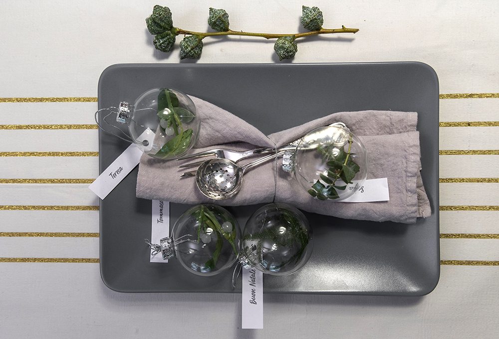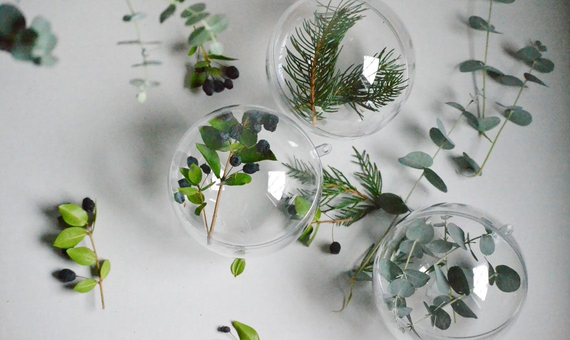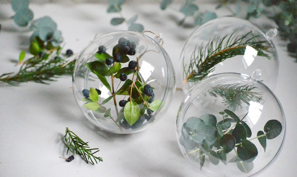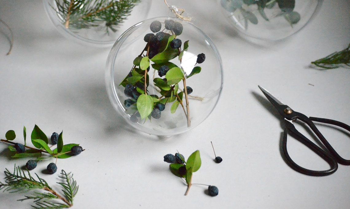 - Prendi le iconiche sfere trasparenti per l’albero di Natale e chiudi i rametti che hai raccolto al loro interno. Una curiosità, io ne ho realizzata una prendendo dei rametti e delle bacche di Mirto, anche se ti sembrerà strano, questa è proprio la stagione perfetta per la raccolta di questa pianta. Quindi dedica un po’ di tempo alla ricerca… ci sono moltissime bacche interessanti in questa stagione, potresti fare ottime scoperte!