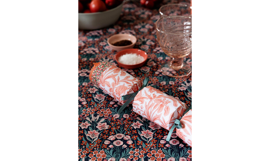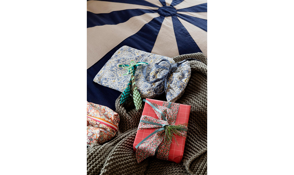 - Rivesti il regalo con la carta, avvolgilo con il nastro Liberty, sovrapponi il nastrino di raso e realizza un bel fiocco.