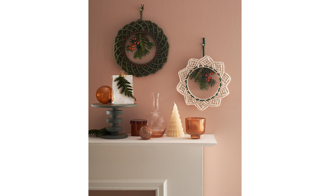 Gli intrecci sono realizzati su due cerchi di metallo di cm 15, con cordoncini di cotone di 3 mm. La ghirlanda verde è lavorata con nodi in diagonale, quella écru con nodi piatti e in diagonale. Il tocco décor? I nastrini passati dentro/fuori nei punti attorno alla circonferenza e i rametti con le bacche.