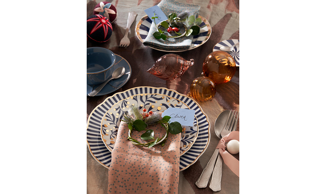 Su piccoli cerchi di metallo – spruzzati di oro, bianco oppure rosso a seconda della tua mise en place – annoda dei rametti rampicanti, come il gelsomino o l’edera (scegli le estremità con le foglie più piccole). Aggiungi i cardi blu e delle bacche rosse come la rosa canina, l’ilex, il biancospino o l’agrifoglio. Completa infine con una tag in cartoncino che riporti il nome dell’invitato o una frase benaugurale.