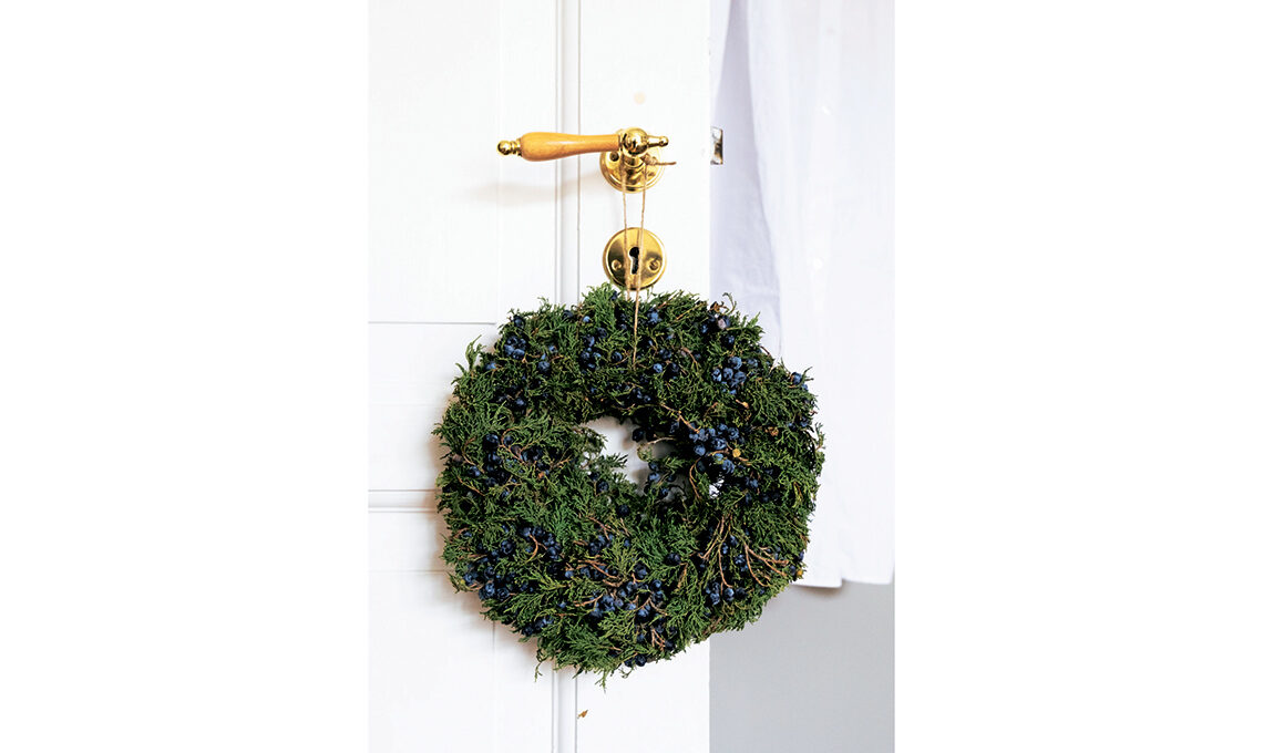 - Procedendo allo stesso modo, decora la ghirlanda con le bacche di ginepro.