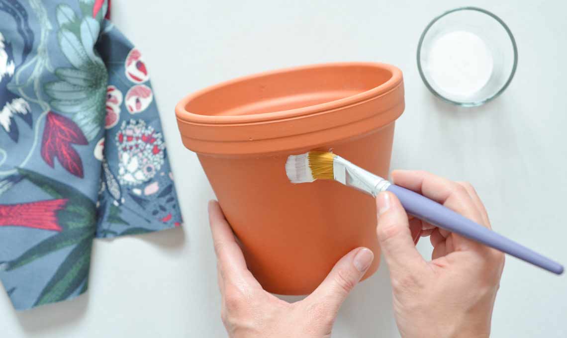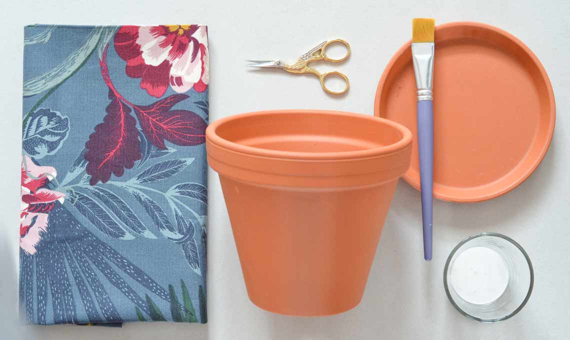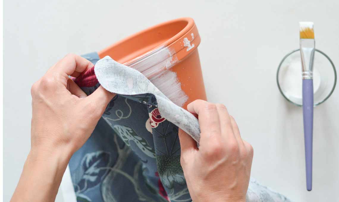 - Stendi la colla vinilica sul vaso e sul sottovaso, quindi rivestili con il tessuto. Evita le pieghe, piuttosto fai qualche taglio nei punti in cui è necessario ripiegare la stoffa.