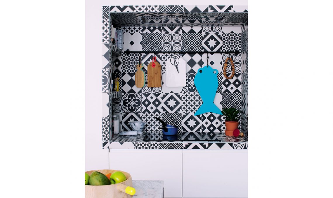 Una nicchia in cucina può ospitare il piano cottura. Qui la nicchia è di cm 120 e contiene un piano a induzione. Rivestita con piastrelle in fantasie diverse bianco e nero diventa [simili le piastrelle della serie Block di Marazzi]. bellissima e raccoglie l'angolo cottura. È un'idea che si può copiare, per esempio, in una cucina a vista sul soggiorno. Il segreto è che le piastrelle siano posate su tutti i lati e formino anche una cornice esterna. Non è difficile da realizzare: scopri cosa serve per posare le piastrelle e come devi fare.