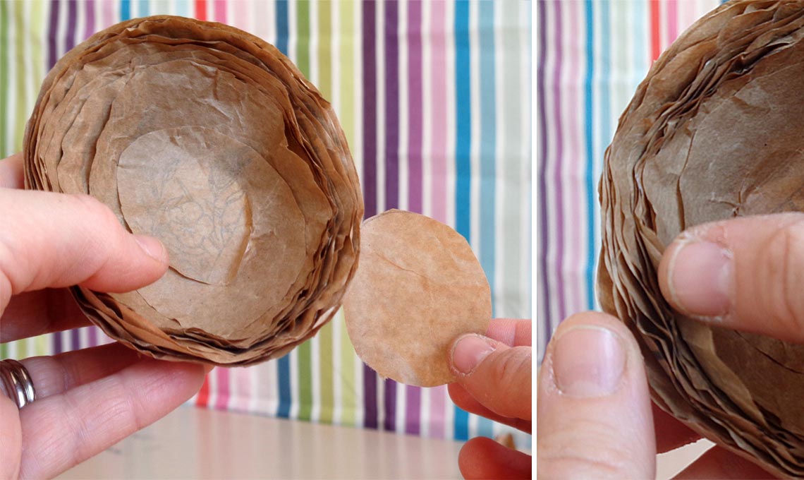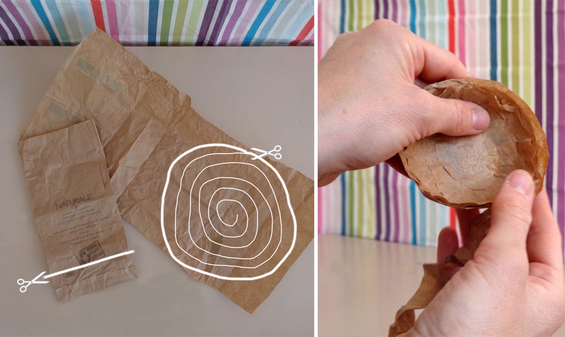 - Ritaglia dai resti del sacchetto un cerchio grande quanto la base della ciotolina ottenuta, e incollalo sul fondo, come rinforzo e per dare stabilità.