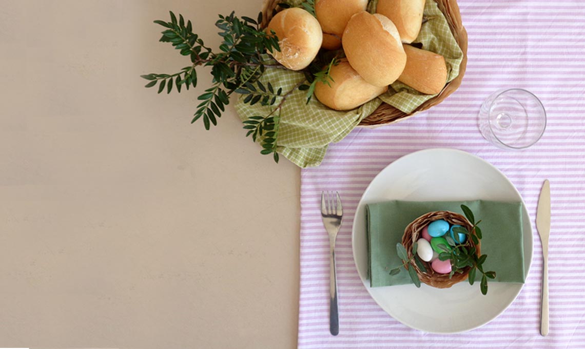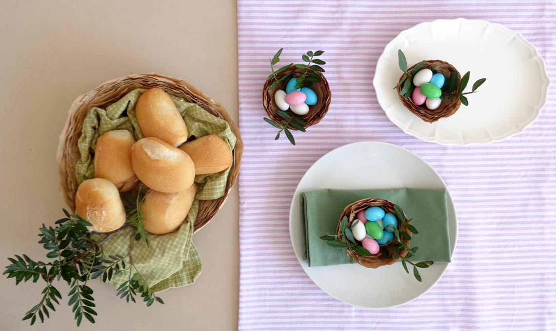 Inserisci qualche elemento verde o dei piccoli ritagli di stoffa come fondo, poi riempili con uova di zucchero e ponili al centro del piatto: sarà un gradito dono per i commensali, e con un bigliettino con il nome saranno dei delicati segnaposto primaverili.