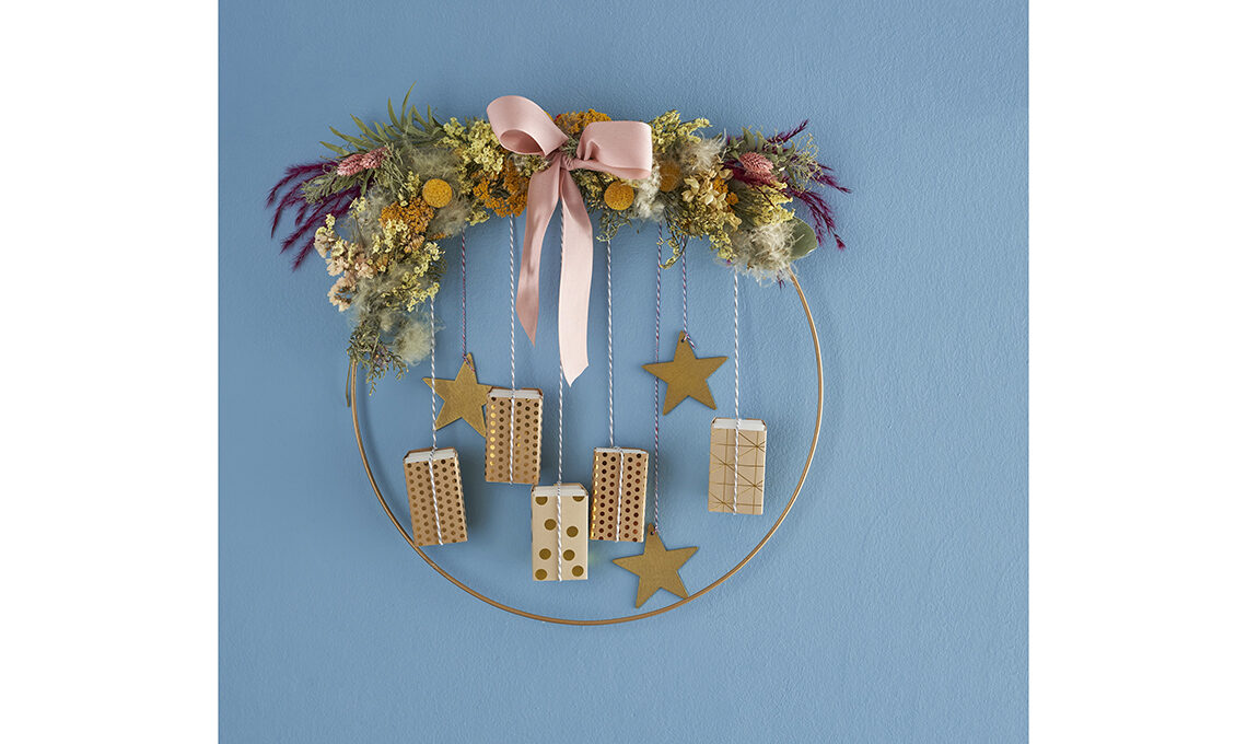 Sul cerchio di ottone, al posto dei classici rami di agrifoglio e di pino, l’elegante composizione di fiori secchi. A cascata, stelle dorate e mini pacchettini a sopresa con le scatole dei fiammiferi. Tutto è pronto per il countdown!
