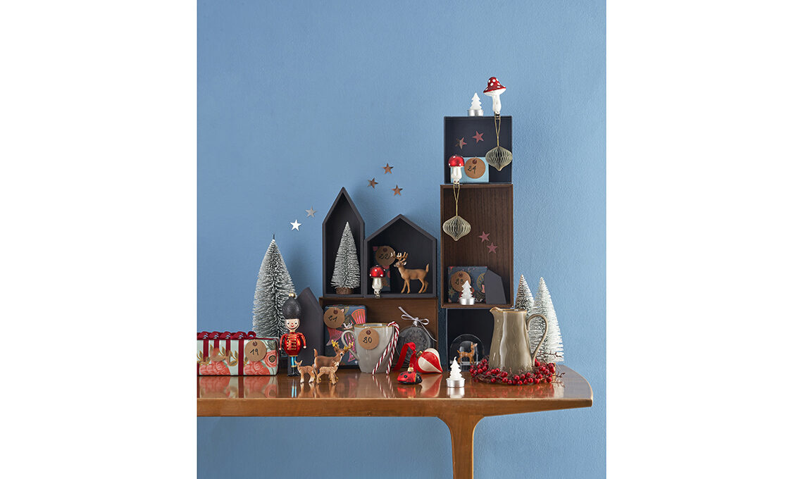 Sulla console di legno sfila un paesaggio natalizio fatto di casette, pini, cerbiatti, funghetti e buffi personaggi. Ma c’è un segreto: nascosti tra gli addobbi ci sono pacchettini regalo da aprire uno al giorno, in attesa del Natale.