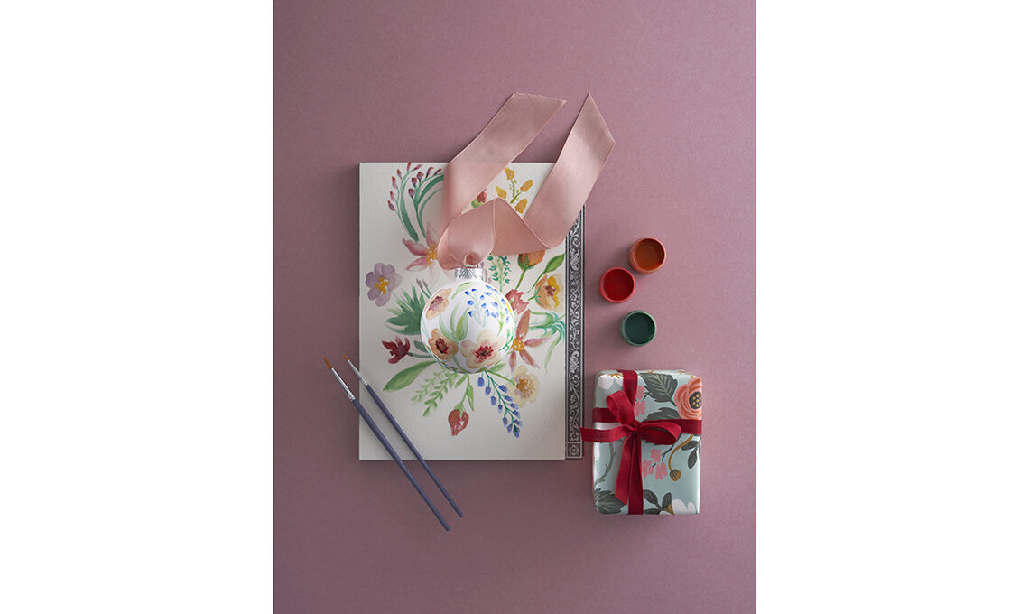 Le palline possono essere usate come regalo. Il decoro ad acquarello continua infatti sul foglio... da usare come biglietto per gli auguri.