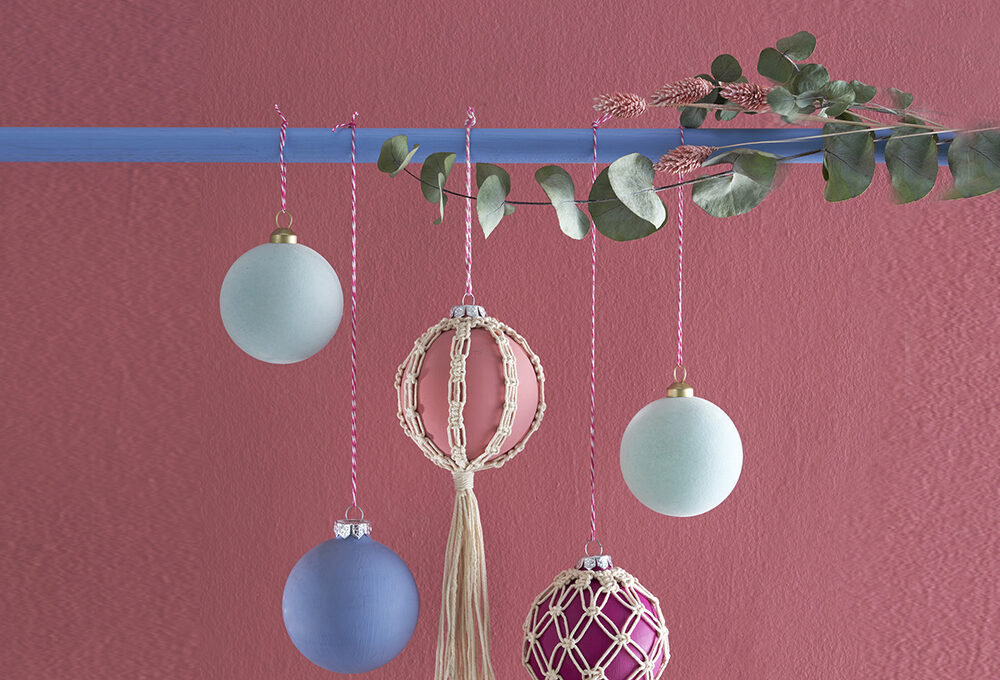 Quando hai delle palline vecchie che non ti piacciono più, puoi dargli nuova vita con il macramè. L'idea in più: sulle palline bianche utilizza i cordoncini colorati.