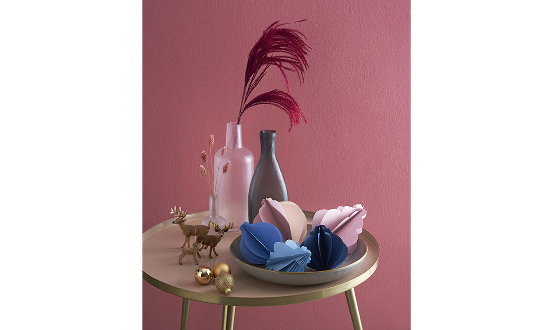 Tavolino Jelva in alluminio ottonato con piano smaltato rosa cipria [Arcarreda], ciotola in stoneware grigio perla della collezione Concerto [Rose e Tulipani]. Vasi bottiglie in vetro opaco colorato [Rituali Domestici], palline decorative oro lucido, satinato e glitter [Casa].