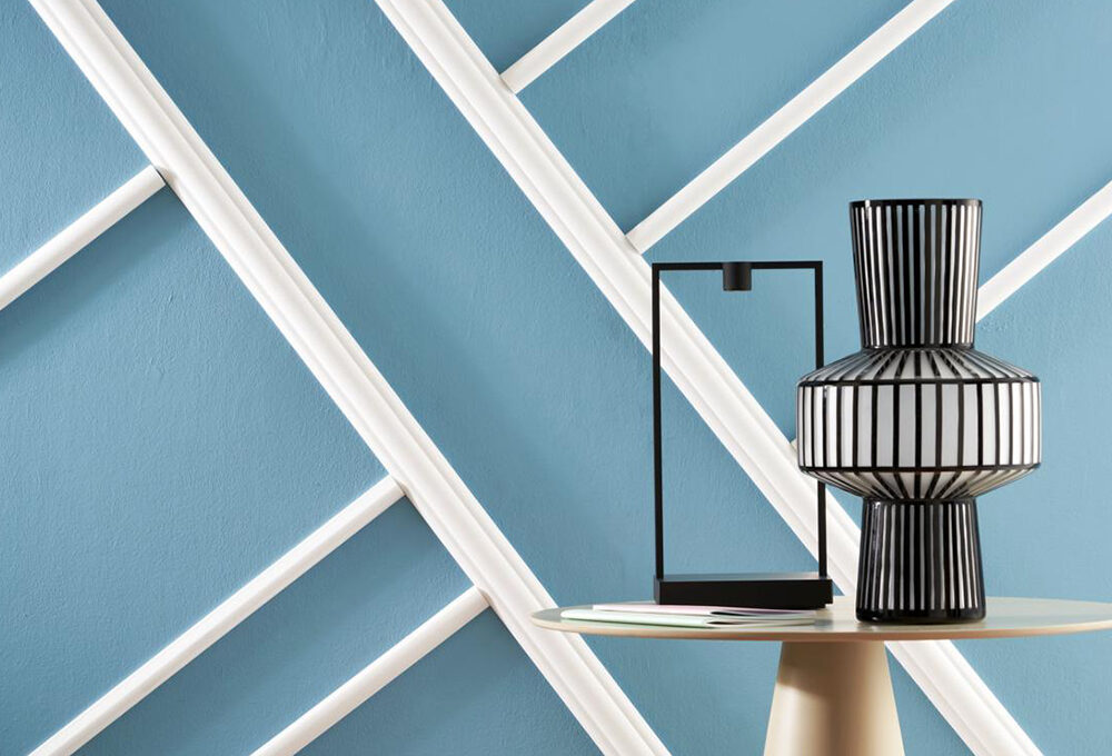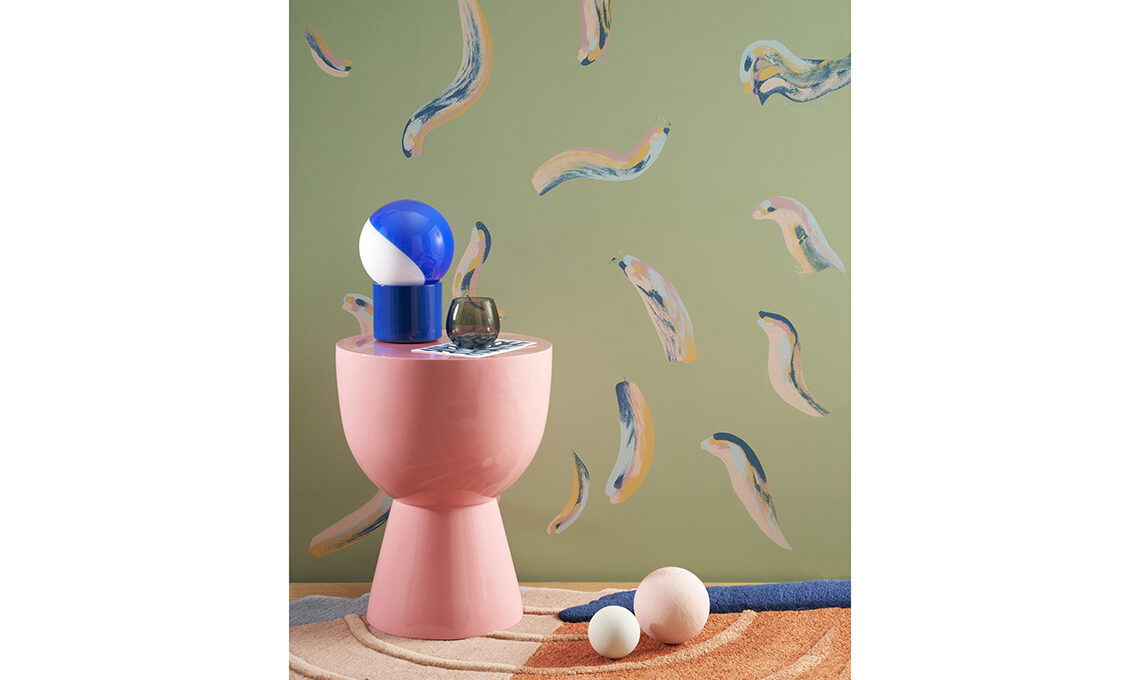Sul tavolino Tam Tam in poliestere laccato rosa [Pols Potten, da Nap Atelier, ø cm 35,5x46 h € 257,50], lampada da tavolo Pulce a luce diffusa con diffusore in vetro opal bianco con pennellate blu e base in alluminio blu [Martinelli Luce, ø cm 16,5x23,5h € 230] e bicchiere multi-glass in vetro soffiato di Murano colore grigio [Nason Moretti, per Carl Hansen & Son]. tappeto della collezione Antropico Entropico [Nodus].