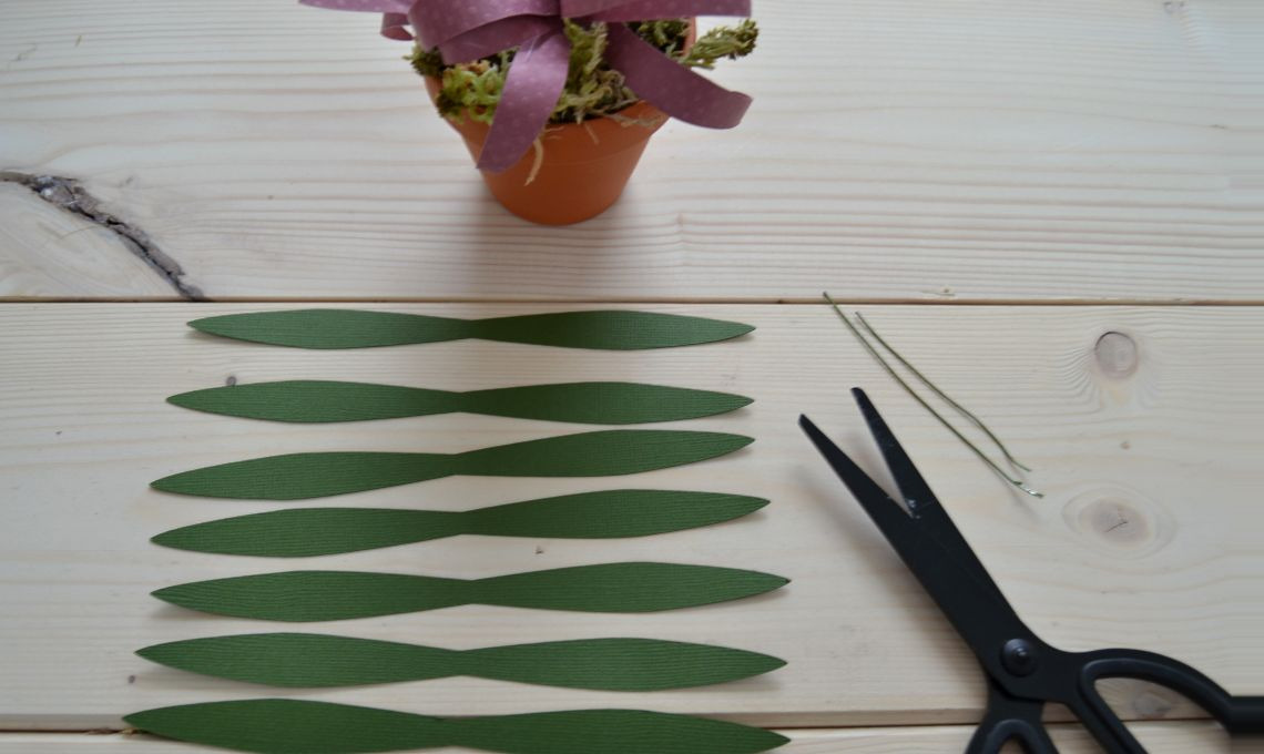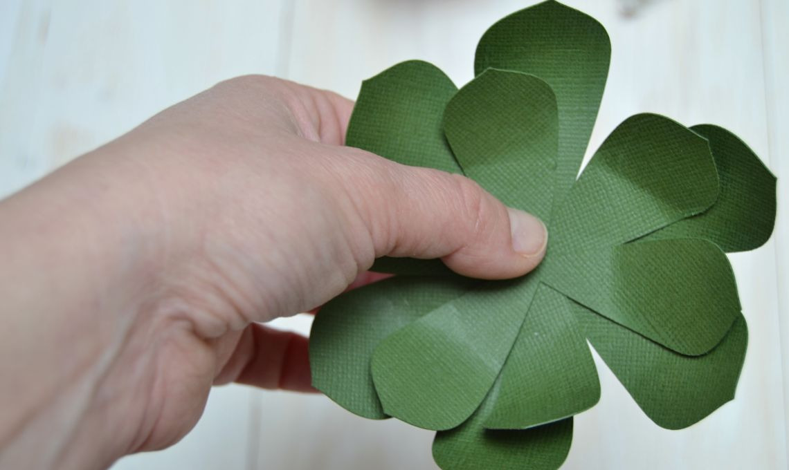 - Piega le foglie al centro e aiutandoti con il dorso delle forbici curva le foglie e fissale con un punto di colla a caldo in modo da dare una forma leggermente circolare.