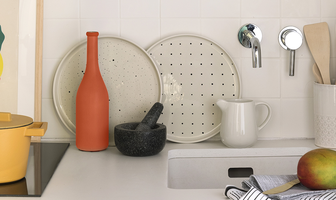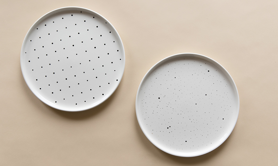 Si ispirano alla matericità delle ceramiche nordiche i piatti décor 'fai da te' a puntini neri.