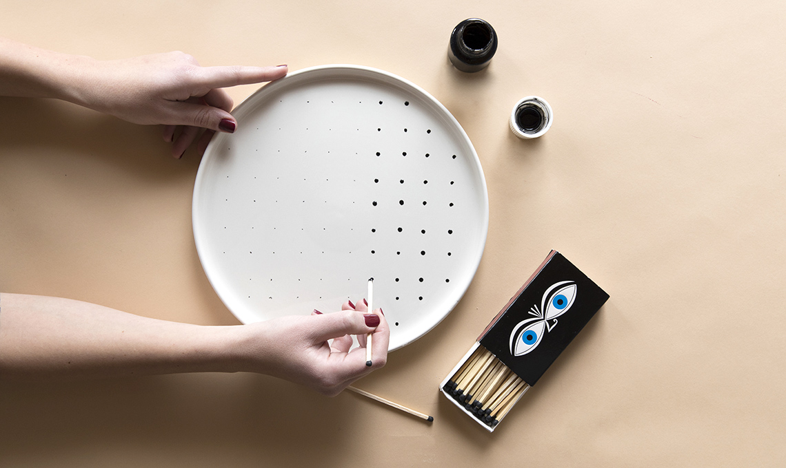 Immergi il fiammifero nella vernice e premi con delicatezza sul piatto, affinché il segno risulti più delicato.