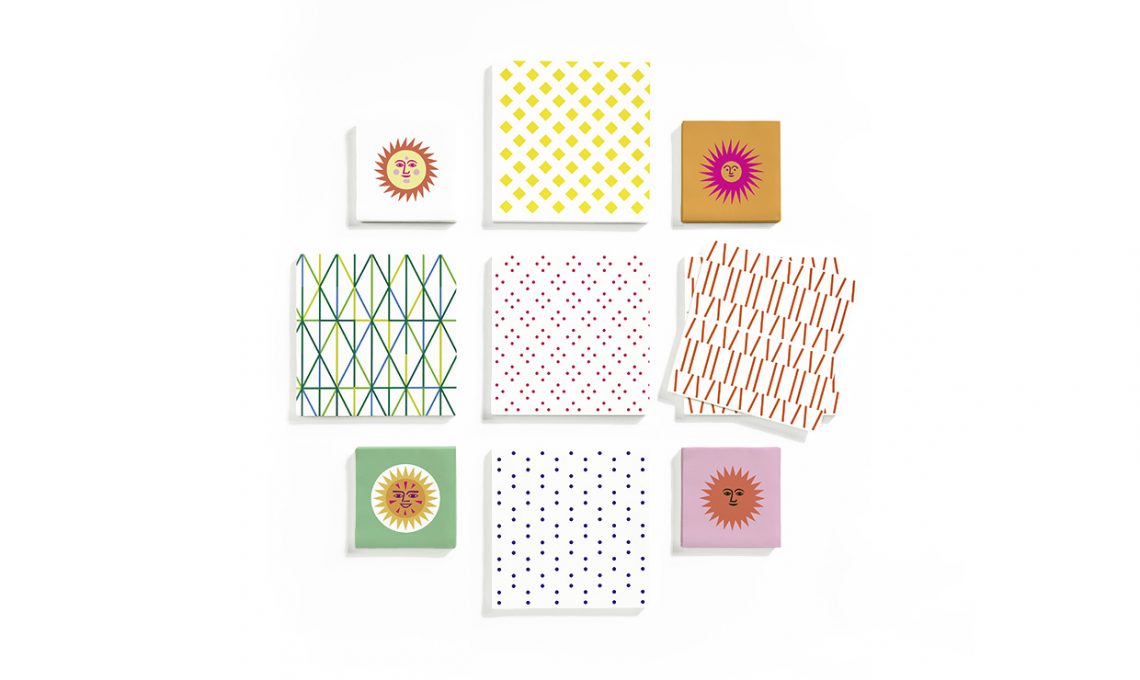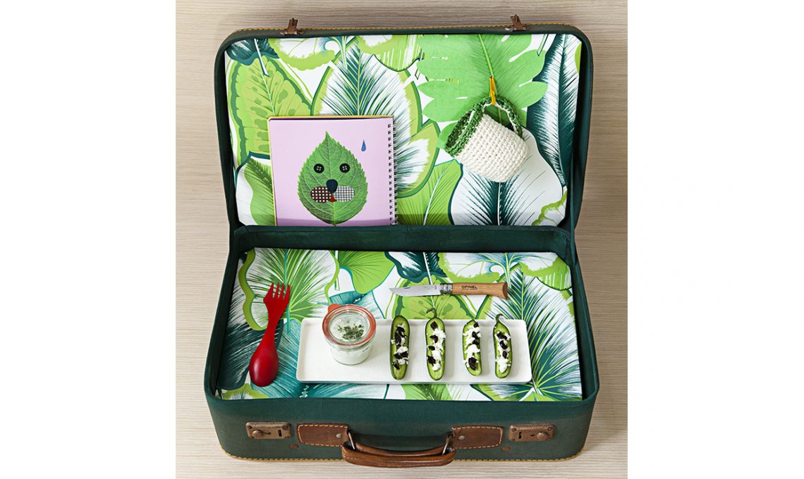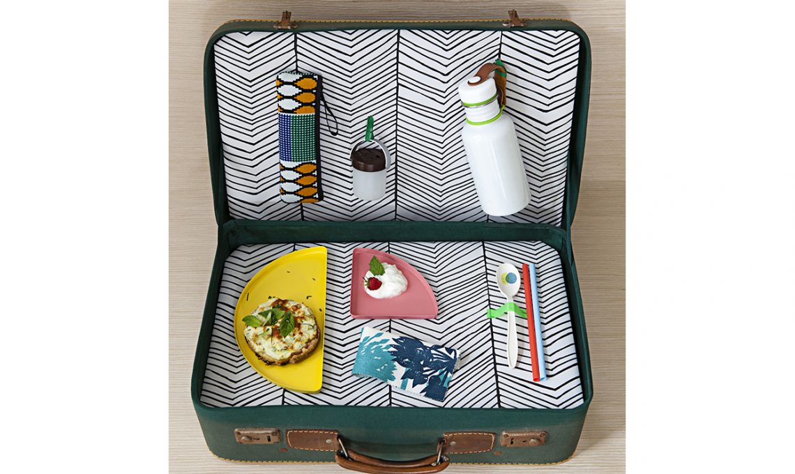 Disegni optical per la carta da parati Herringbone [Ferm Living, m 10x53 cm, €81/rollo], bustina in tessuto tecnico con zip [Pijama €21], lanterna a energia solare [Ikea €14,90]. Bottiglia termica Box appetit [Black+Blum, 0,50 litri €15]. Il fondo (per tutte le valigie) è realizzato con pannelli in legno composto, della coll. Nordic [Alpi], rivestiti con carta da parati. Idea décor easy: bolli adesivi colorati [Ikea] sul cucchiaio in plastica usa&getta. È realizzato con il tessuto Mareva Turquoise [Pierre Frey] il tovagliolo a tema botanico. Vassoietti in metallo colorato [Tiger, €3 quello giallo, €2 quello rosa].