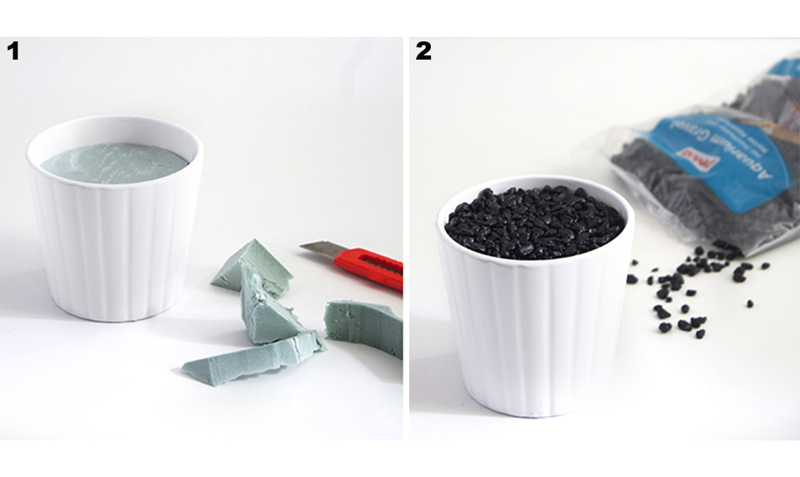 Taglia la spugna verde da fiorista nella dimensione del vaso e incastrala nel contenitore.