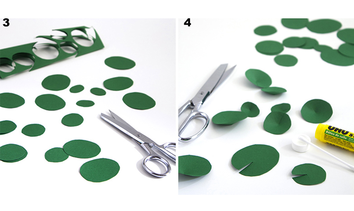 Prendi il cartoncino verde, piegalo a fisarmonica ogni 5 cm sul lato più lungo, per tagliare poi in contemporanea più cerchi. Hai una striscia plissettata di cm 5x30 sulla quale disegnerai 4-5 cerchi e ovali di diametro da cm 2 a 4,5 (le foglie). Ritagliali con le forbici.