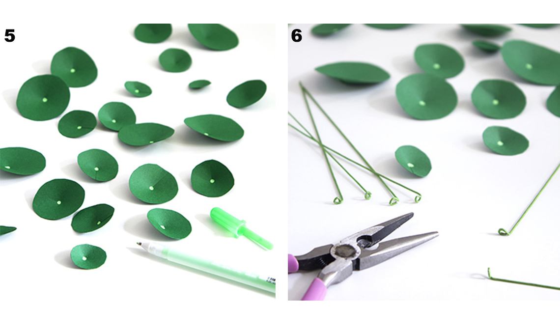 Al centro di ogni foglia fai un punto con la penna gel verde.