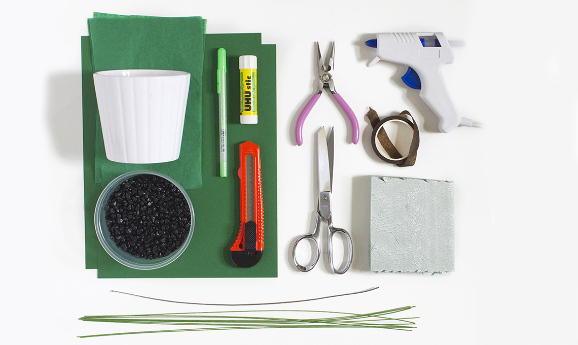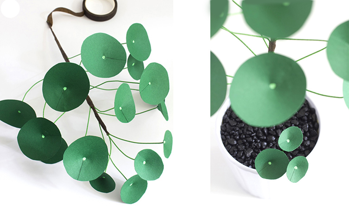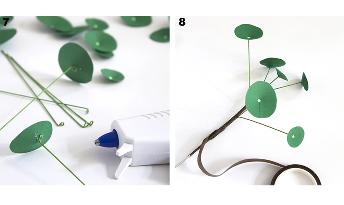 Per finire, prendi un pezzo di fil di ferro lungo cm 40 e con il washi tape marrone avvolgi uno stelo alla volta al ‘gambo centrale’, dando il portamento della pilea. Quando avrai finito la composizione, inserisci lo stelo nel vaso e... modella la tipica forma a ‘S’ della pilea. Eretta e sinuosa o ricadente? Scegli tu il portamento della tua pilea in carta. Un consiglio di Corrie: realizza la tua ‘paper plant’ copiando un esemplare dal vero!