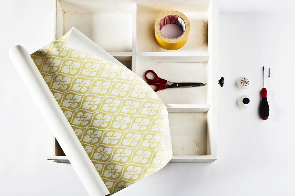 Tutto quello che ti serve è un vecchio cassetto, della pittura acrilica, pomelli e carta da parati.
