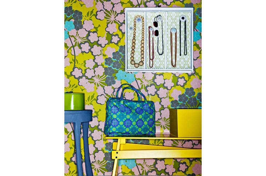 • Incolla gli avanzi di carta da parati sulle parti che preferisci (puoi mixare più pattern). Unisci con la colla e punta gli spilli negli angoli per mantenerli saldi.