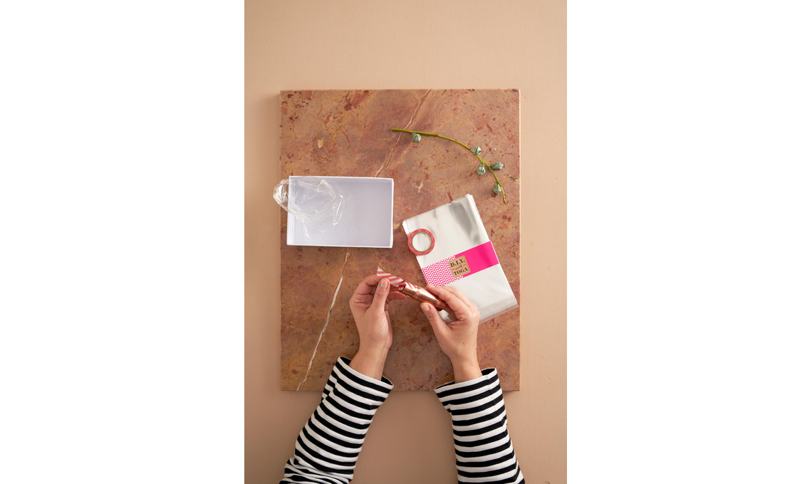 4 Per evitare che il cemento liquido tappi il tubo di rame, copri l’estremità inferiore con del nastro adesivo. Posiziona ora il tubetto al centro del sacchettino.
