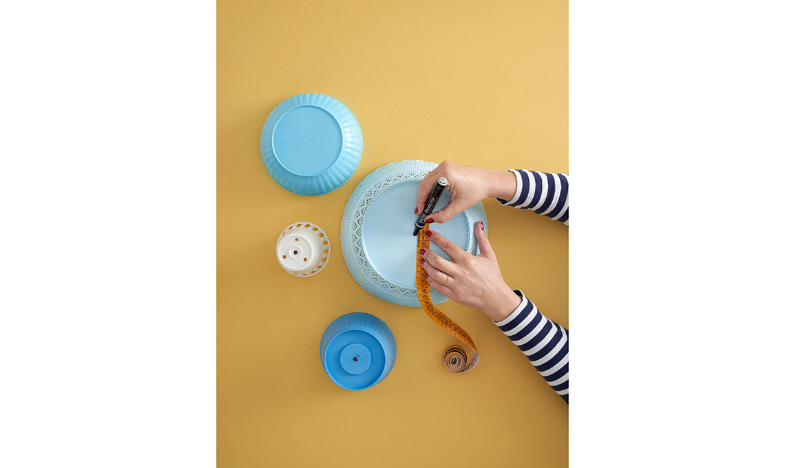 1. Aiutandoti con il metro, trova il centro delle ciotole e traccia con il pennarello un segno di riferimento.