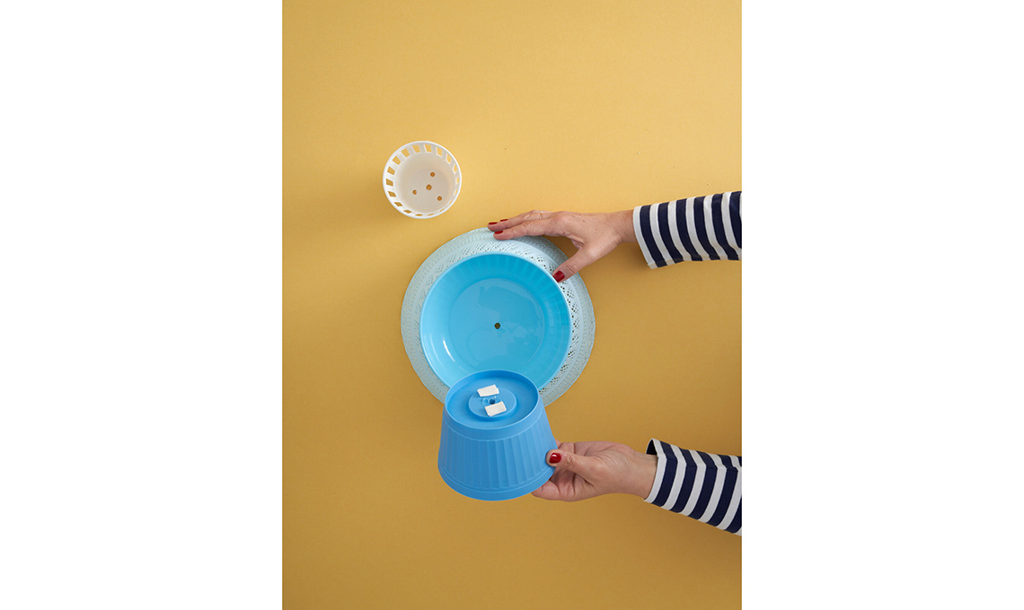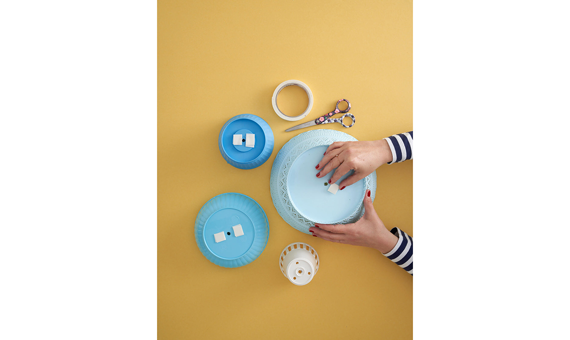 3. Per unire tra loro le ciotole usa il nastro biadesivo. Sovrapponi più pezzi per creare il giusto spessore.