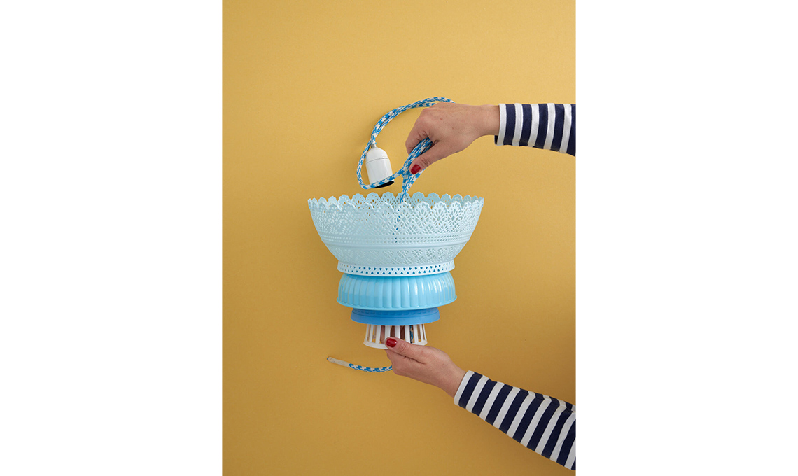 Spazio alla fantasia: mixa cavi elettrici tinta unita, a righe, pied de poule o intrecciati e scegli un portalampada in silicone o di ceramica. Non solo ciotole, ma anche scolapasta, portaposate e cestelli sono perfetti per creare le lampade/totem. Il colore delle ciotole magari non ti piace? Puoi dipingerle con lo spray all’acqua.