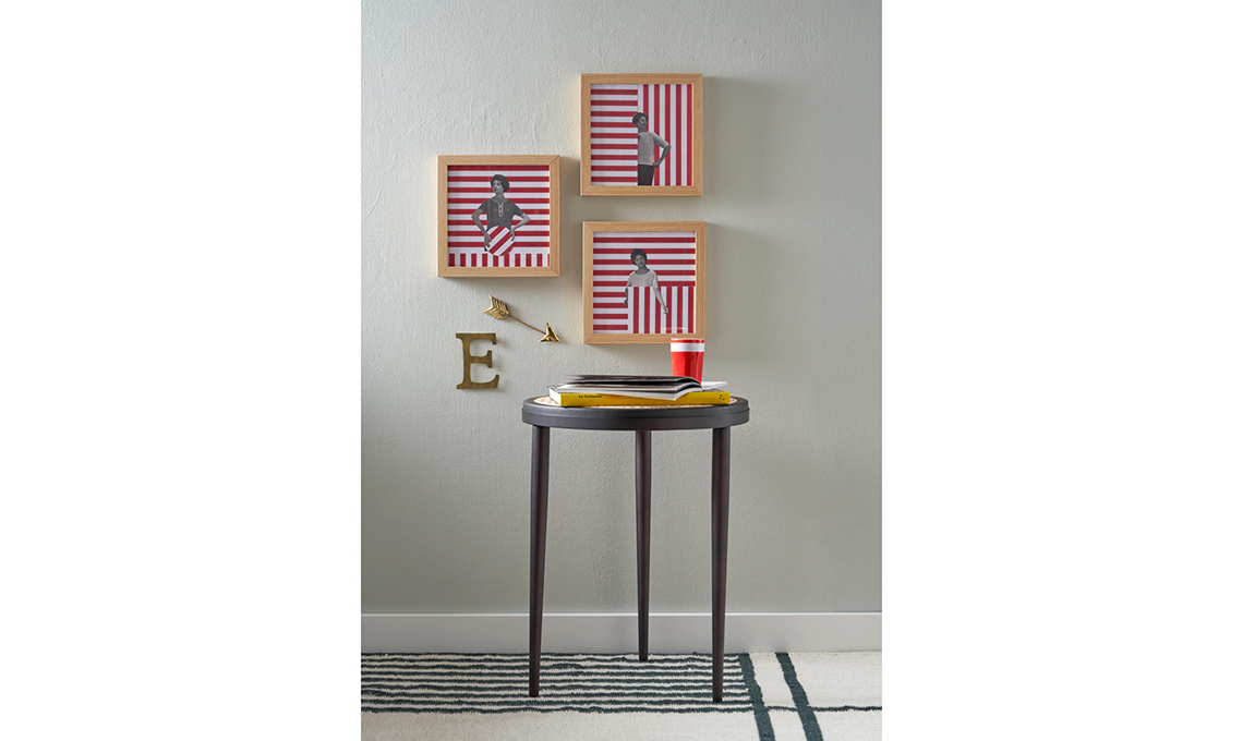 Ritaglia dal cartoncino rosso delle strisce dello spessore di 7 mm. Incollale sul cartoncino bianco in orizzontale o verticale, per creare un pattern. Ritaglia la foto vintage e incollala sul fondo, come se uscisse dalle strisce.